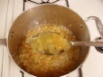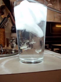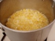 Put the chopped Buddha Hand into the saucepot and add the 3 cups of water and 3 cups of sugar. Put it on medium heat and wait for it to boil. Immediately adjust the heat to a simmer and allow it to bubble slowly for somewhere near three quarters of an hour. As it reduces, the sugar syrup will become thicker and the fruit will start to become translucent. Don't be alarmed if some fruit retains whiteness during cooking because it will be transformed as it cools. The cooking is finished when the syrup reaches the thread stage, about 230*F-235*F, but you will not need a thermometer to test for the right consistency! The glass of ice water is the ideal test tube for the stages of cooked sugar syrups. See the next step for more details...